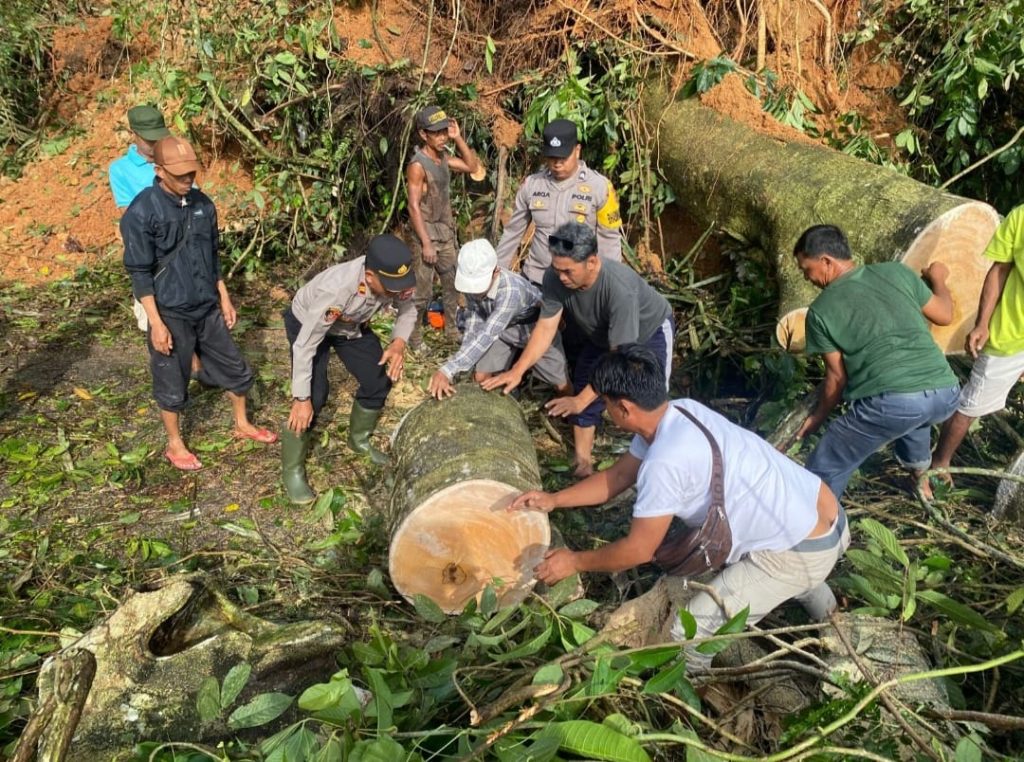 KAUR – BERITABENGKULU.ID- Personel Polres Kaur bersama Polsek Kaur Tengah bergerak cepat menangani bencana alam berupa tanah longsor dan pohon tumbang yang menutup akses jalan utama di Desa Tuguk, Kecamatan Luas, Kabupaten Kaur, Rabu (17/12/2025).