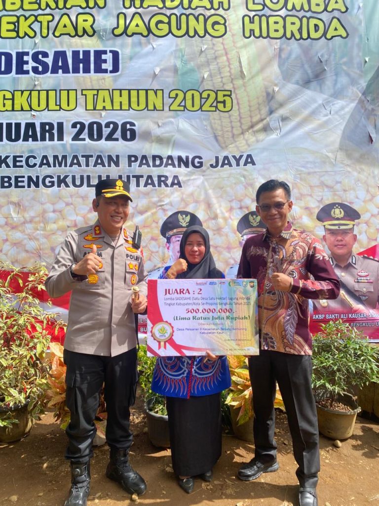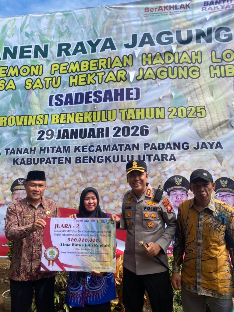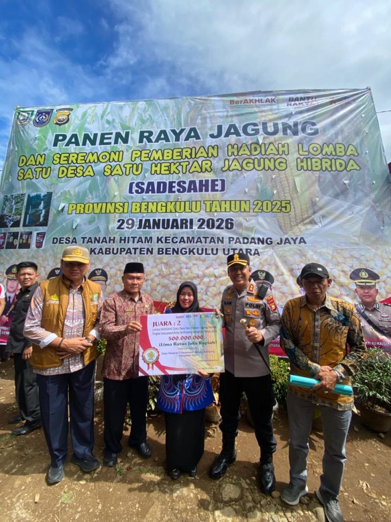 Kaur – BeritaBengkulu.id, Kapolres Kaur AKBP Alam Bawono, S.I.K., M.Tr.Opsla menghadiri seremoni penyerahan hadiah Juara II Lomba Satu Desa Satu Hektar (SADE SAHE) tingkat Provinsi Bengkulu Tahun 2025 yang dirangkaikan dengan kegiatan Panen Raya Jagung, bertempat di Desa Tanah Hitam, Kecamatan Padang Jaya, Kabupaten Bengkulu Utara, Kamis (29/1/2026).